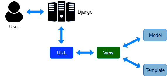 Here User first sends the request to the Django server or application, then the request is passed to the URLs file, hereafter it goes to the views file then to models, and then templates, and the response is shown in the template file.