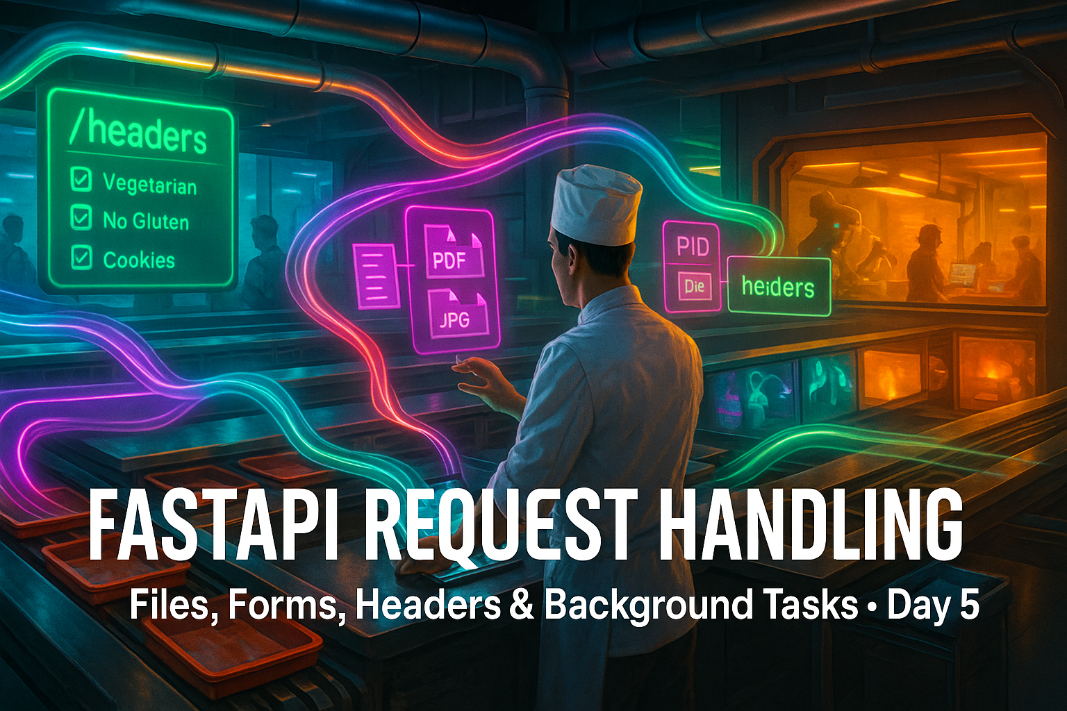Picture this: Back in that hectic restaurant kitchen, orders aren’t just scribbled notes — they come with extras like special diets (form data), photos of custom cakes (file uploads), or loyalty cards (headers/cookies). Mishandle them, and the meal flops. In FastAPI, request handling is about grabbing all that incoming data smoothly, so your app responds perfectly.